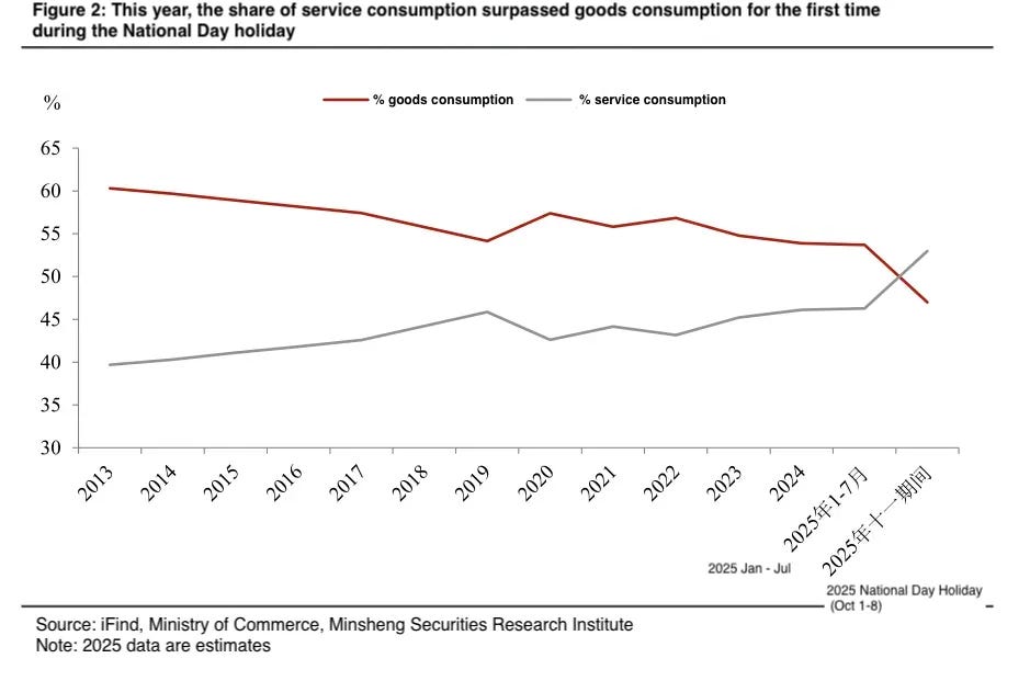 For the first time, during this year’s eight-day National Day holiday, service spending accounted for a larger share of total consumption than goods. Despite the broader deflationary environment, services led the way in 2025.