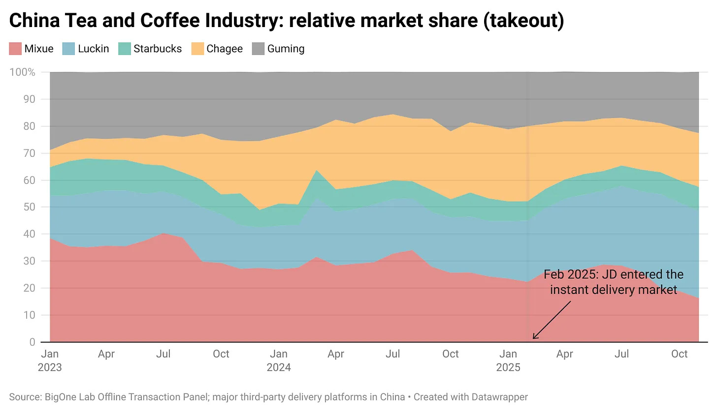Chagee and Starbucks, however, took a more principled—and ultimately painful—stance. Both brands largely refused to join the subsidy bloodbath in order to protect their premium positioning. The outcome was mixed. By November 2025, Chagee’s relative takeout market share had fallen sharply. Meanwhile, peers such as Luckin used subsidies to aggressively expand, and Starbucks—despite also staying out of the price war—managed to retain comparatively greater resilience in market share.