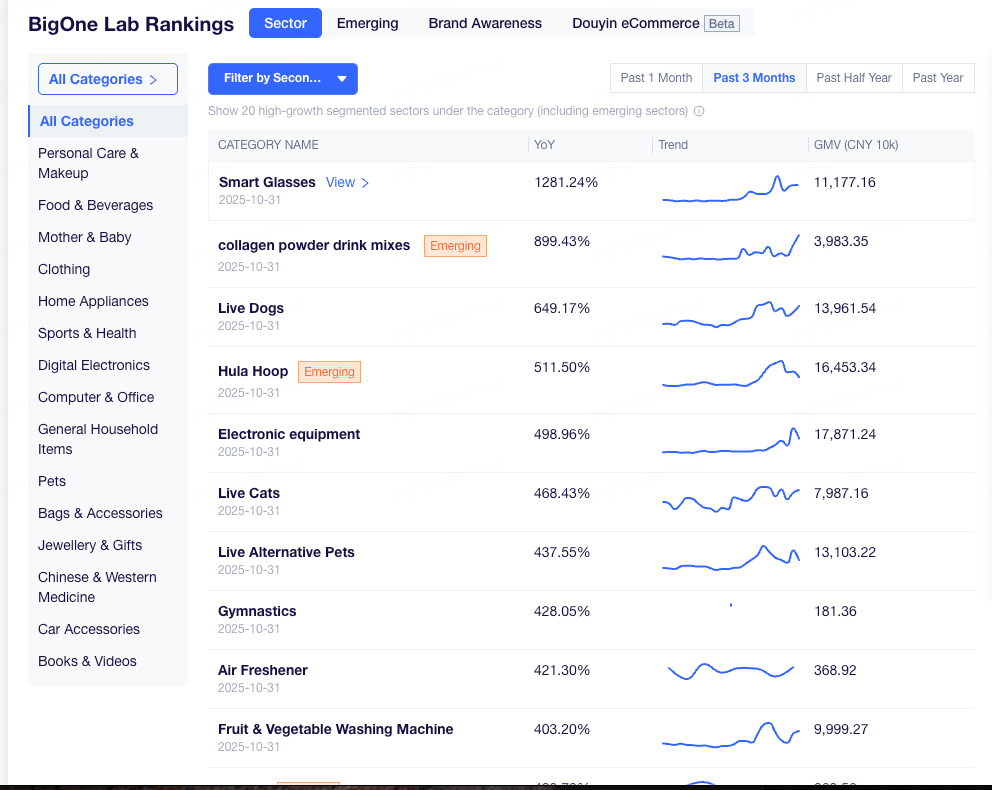 According to our tracking across major e-commerce platforms, smart glasses have consistently topped sales charts over the past three months, recording the fastest year-on-year growth across all categories.