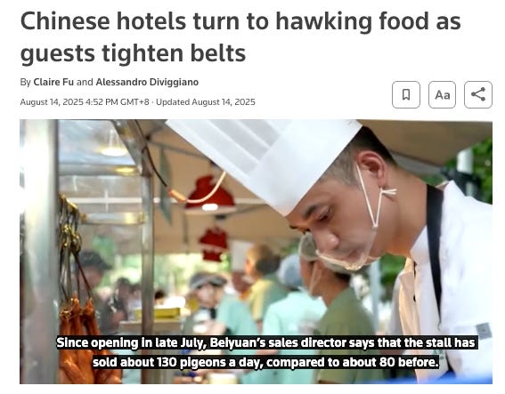 What does it look like when China's high-end hotels hit a wall? It looks like the Beiyuan Grand Hotel in Beijing, where staff set up street stalls every evening to hawk their signature crispy roast pigeon for 38 yuan ($5.29) a bird—a steep discount from the 58 yuan it costs inside.