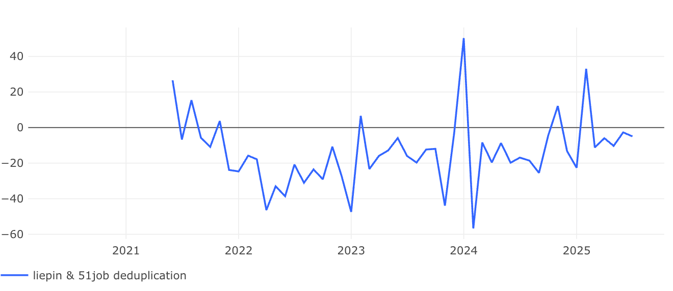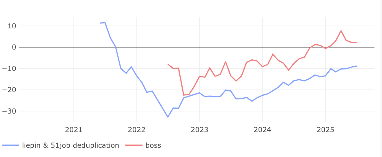 Overall hiring market: After a noticeable rebound in new job postings on BOSS Zhipin during March–April 2025, momentum tapered off as the traditional summer lull set in