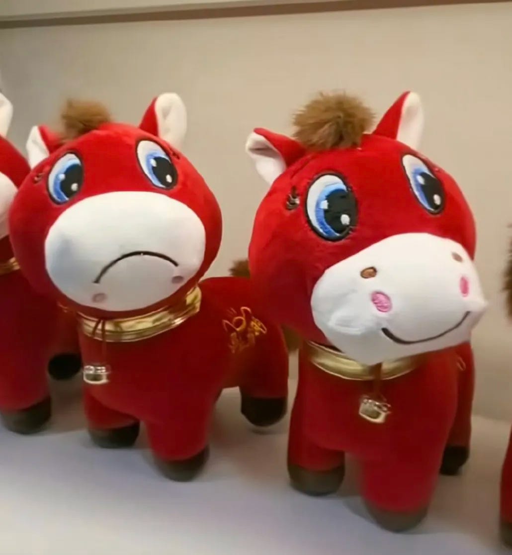 It began as a simple manufacturing mishap in Yiwu, Zhejiang Province—the world’s small commodities capital. A factory worker accidentally stitched the mouth of a red plush horse upside down, turning its intended cheerful grin into a downturned pout. Originally designed as a lucky mascot bearing the phrase “money comes quickly” (a pun on “horse” sounding like “money” in Chinese), the toy was meant for the 2026 Lunar New Year celebrations.