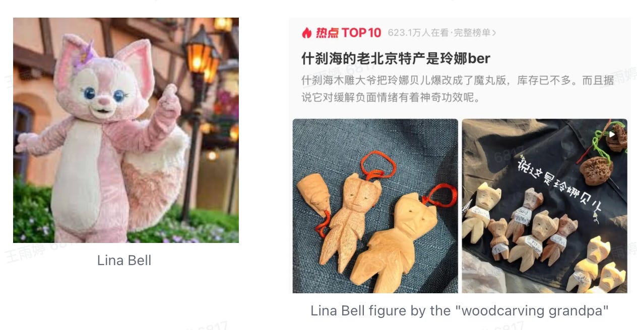 One of his most sought-after pieces is a take on “Lina Bell” (the viral pink fox IP from Disney, hugely popular among Chinese fans in recent years). Yet his version looks nothing like the original. When asked about it, he simply said: “I saw it on a lady’s purse—it looked cute—so I carved it based on my own interpretation.“