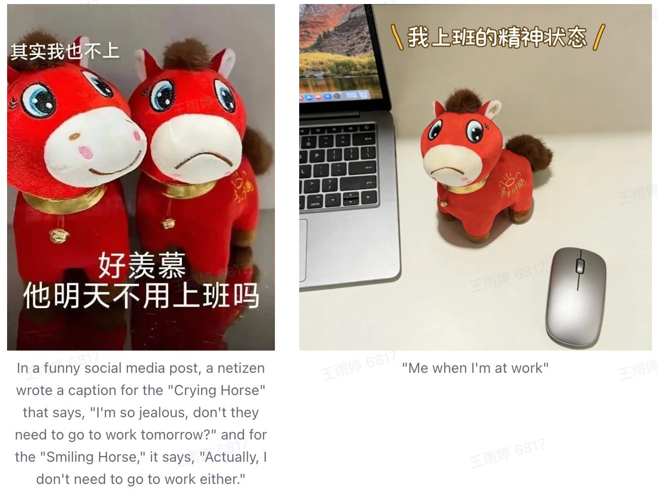 But what started as a defective item suddenly went viral after a buyer in Hangzhou posted photos on social media, dubbing it the “Cry-Cry Horse” (哭哭马). Netizens flooded the comments, asking where they could get this defective version. Many netizens added labels like “Monday horse” and “overtime horse” next to the “Cry-Cry Horse,” jokingly referring to their daily grind at work. (”Horse and cattle” is internet slang used by the Chinese to describe employees who face repetitive, grinding work, burnout, and stress.)