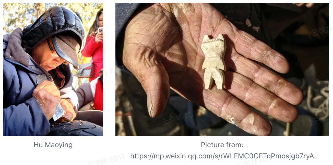 But behind the scenes, what truly drives the enthusiasm is the perseverance of “Woodcarving Grandpa,” whose real name is Hu Maoying. Despite his unskilled craftsmanship, Hu’s persistence for more than 10 years has won him attention. Originally from Anhui province, Hu moved to Beijing with his family 20 years ago as a migrant worker. Like many other migrant workers, he took on mundane jobs such as cleaning and part-time work before deciding to sell his woodcarvings.