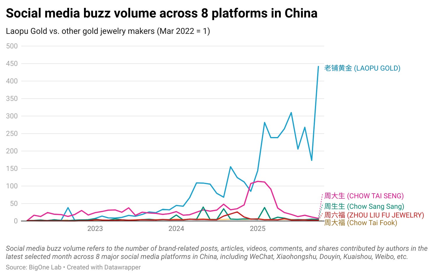 Although the gold price rally should benefit overall gold jewelry makers, not every leading brand in China experienced the same explosive growth in online discussions compared to Laopu Gold.