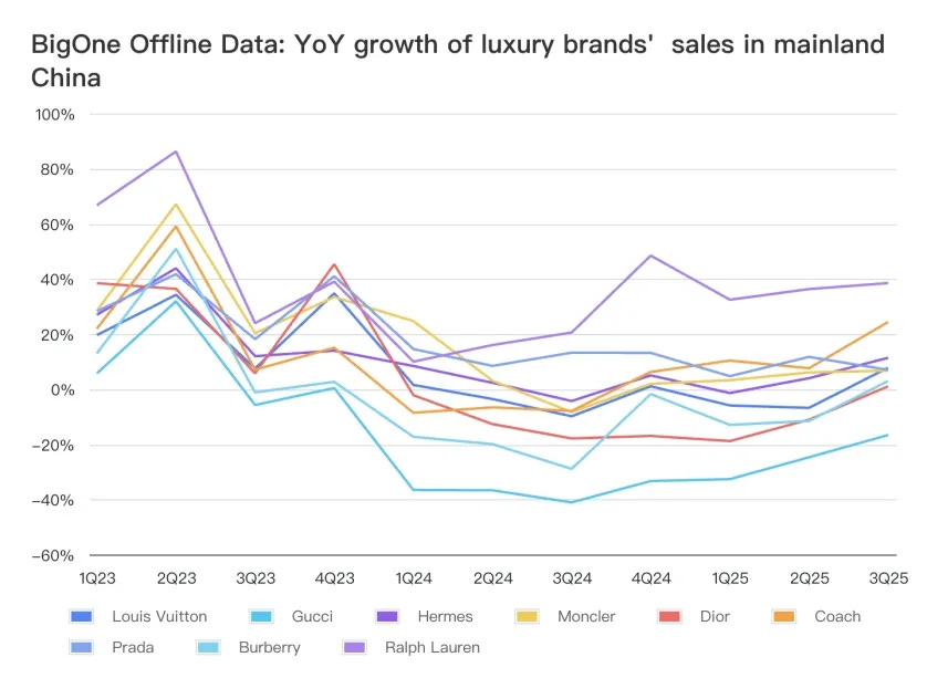 Most luxury brands showed an improving or accelerating year-over-year growth in Q3 2025, possibly boosted by the improved sentiment among middle-class and wealthier households as China’s equity market delivers upbeat returns YTD.