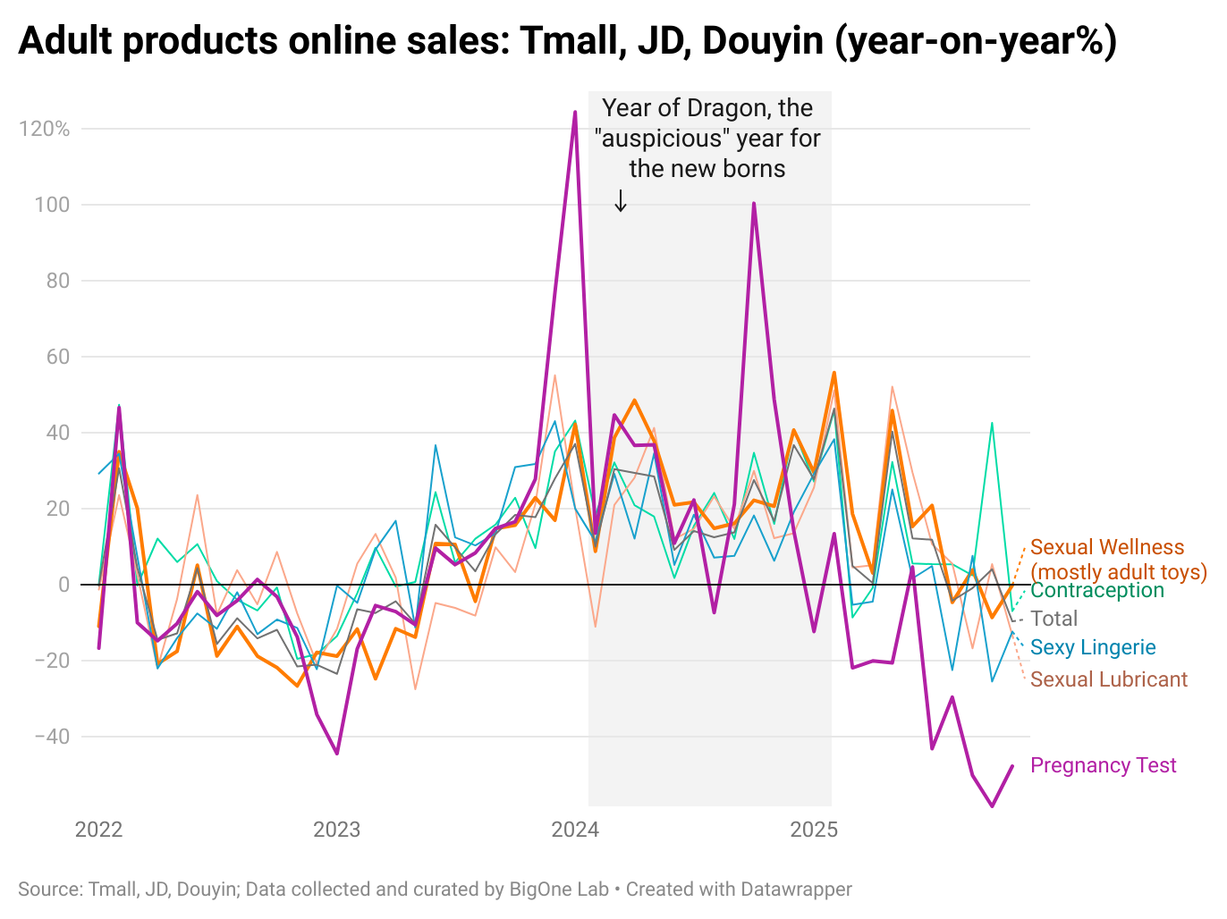 BigOne Lab, the parent company of the Baiguan newsletter, tracks online sales trends across multiple consumer categories. Sales growth of pregnancy tests peaked around 2024 and has been declining steadily since, with a noticeable acceleration in the second half of 2025. (2024 was the Year of the Dragon, traditionally viewed as an auspicious year for childbirth in China and usually associated with a temporary baby boom.)