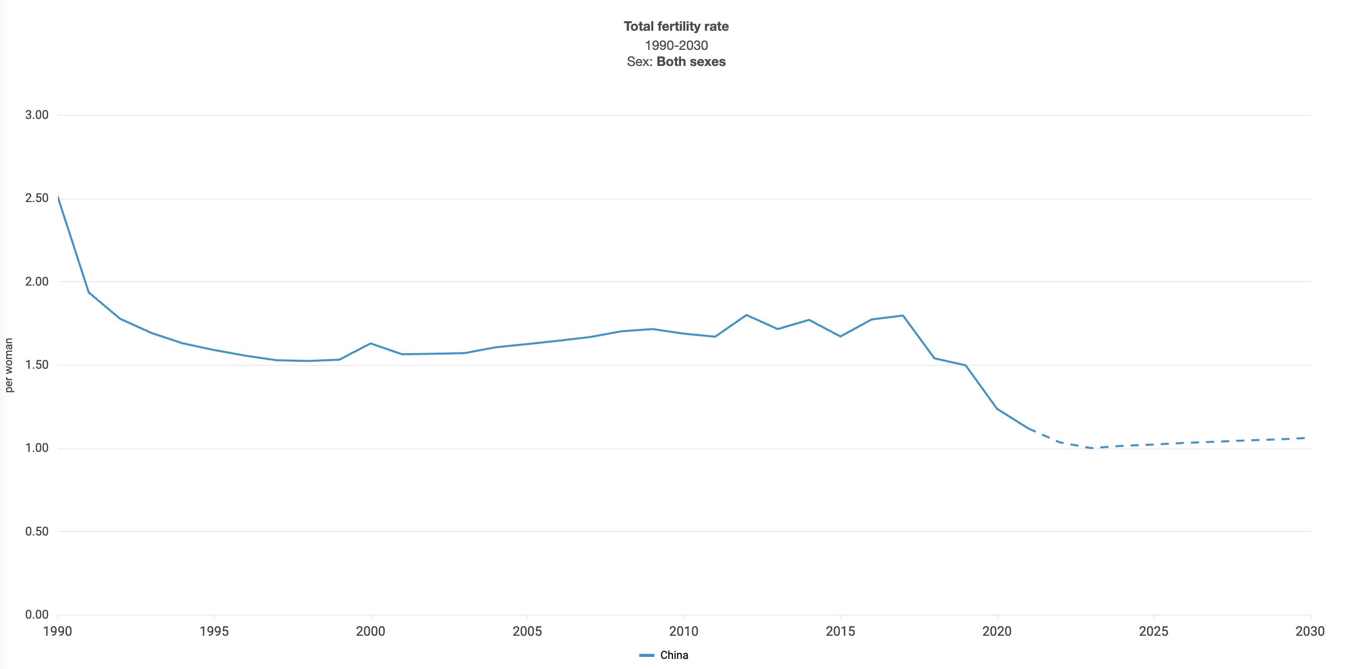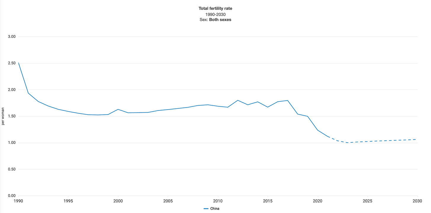For reference, the replacement level required to maintain population stability is 2.1—China is not even close.