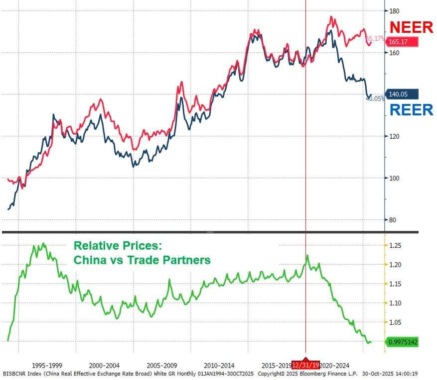 Over the past several years, China has experienced close to zero inflation, while most major trading partners have gone through sustained inflation of 2–5%. This inflation differential has accumulated. As a result, China’s relative price level today is meaningfully lower than it was five years ago.